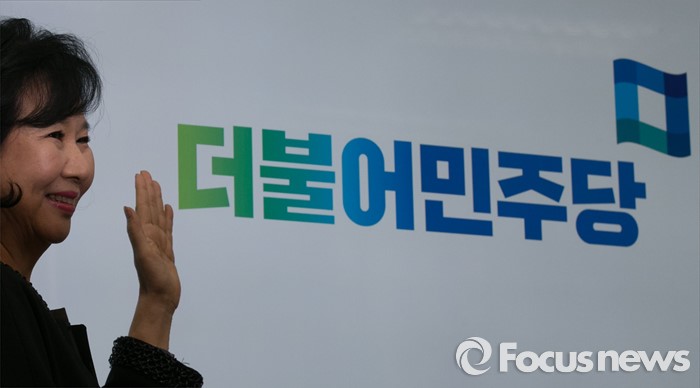 (서울=포커스뉴스) 손혜원 더불어민주당 홍보위원장이 7일 오전 서울 여의도 국회에서 당 로고 공개 기자간담회에서 취재진을 향해 포즈를 취하고 있다.