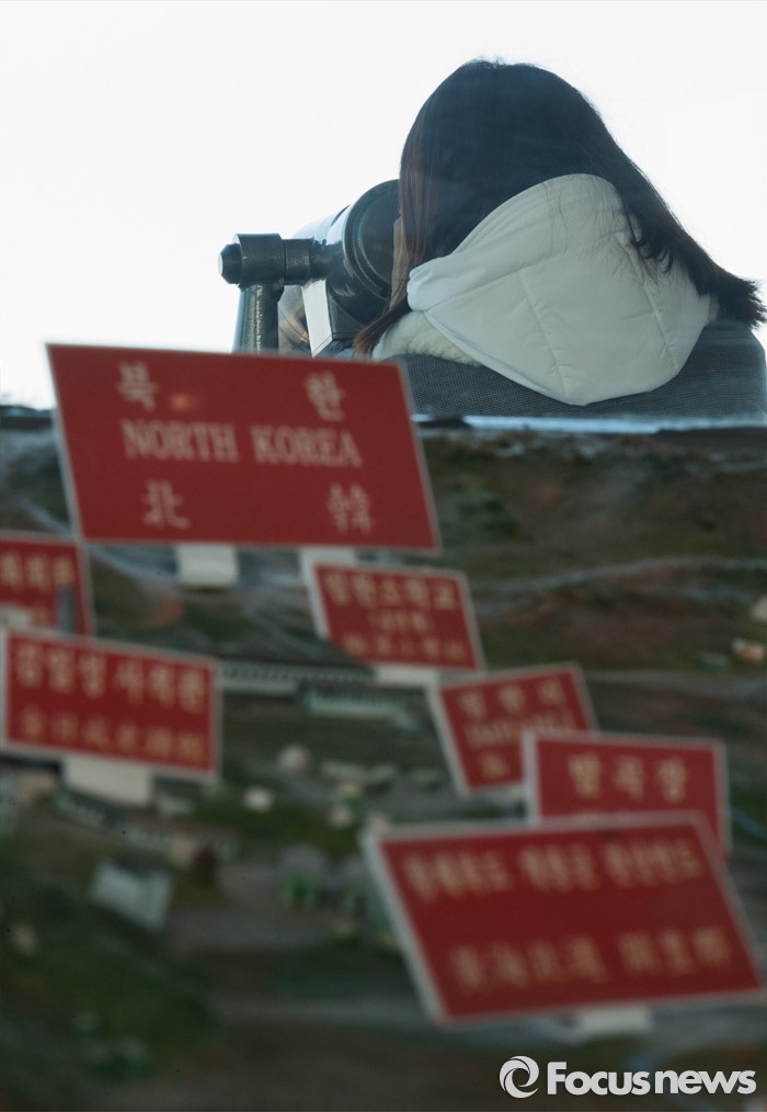 (파주=포커스뉴스) 7일 오전 경기도 파주 오두산 통일전망대에서 관광객이 망원경을 통해 황해북도 개풍군 일대를 관측하고 있다.