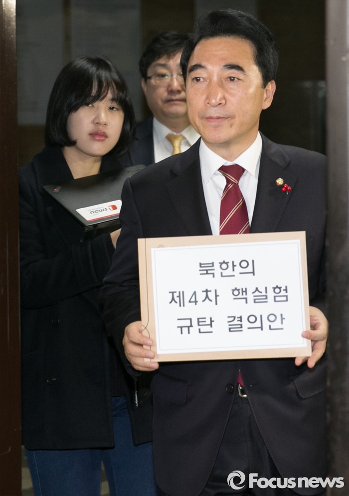 (서울=포커스뉴스) 박수현 더불어민주당 원내대변인이 7일 오전 서울 여의도 국회 의안과에서 북한 4차 핵실험 규탄 결의안을 제출하고 있다.