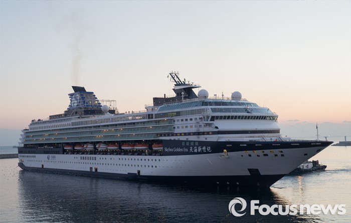(동해=포커스뉴스) 7일 오전 강원 동해항 중앙부두에 중국 천해크루즈사의 스카이씨 골든 에라호가 승객 1천800여 명을 싣고 입항하고 있다. 이날 강원도를 찾은 관광객 1천800여 명은 정선 강원랜드 눈썰매장, 평창 용평·알펜시아스키장, 속초 중앙시장, 설악산 등을 둘러볼 예정이다.