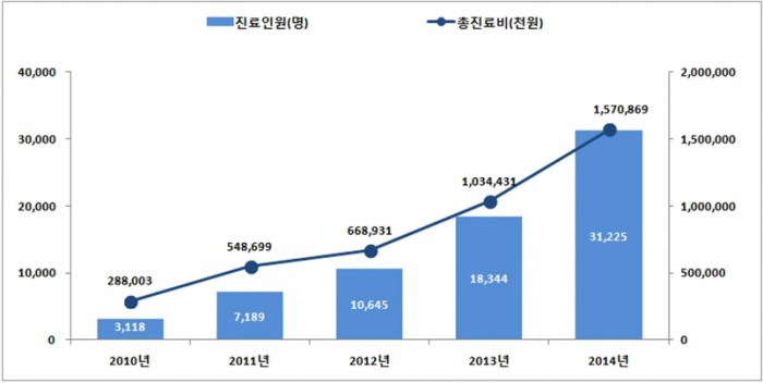 총 진료비는 2010년 약 3억원에서 2014년 약 16억원으로 5년 전에 비해 약 13억원이 증가했다.