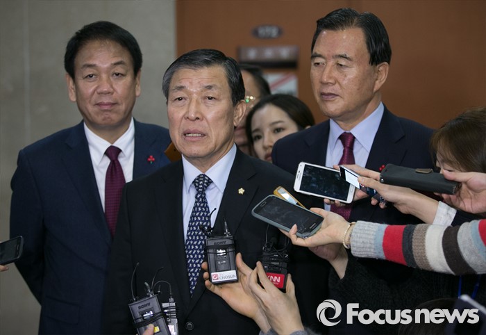 (서울=포커스뉴스) 황진하 새누리당 공천제도특별위원장이 7일 오전 서울 여의도 국회 정론관에서 특위 회의 결과에 대한 브리핑을 마친 뒤 취재진 질문에 답하고 있다. 왼쪽부터 박종희 제2사무부총장, 황 위원장, 홍문표 의원.