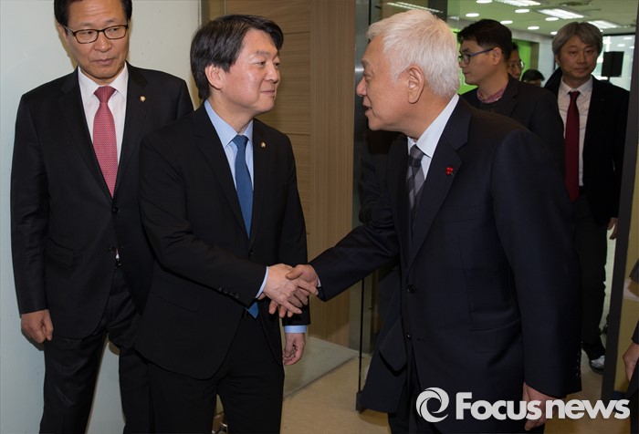 (서울=포커스뉴스) 야권 신당을 추진 중인 안철수, 김한길 무소속 의원이 7일 오후 서울 마포구 신당 당사에서 국민공감포럼 신당 참여 기자회견과 북한 핵실험 관련 성명 발표를 마친 뒤 인사를 하고 있다.