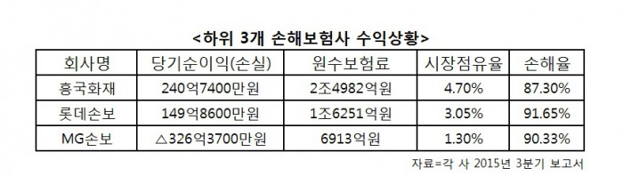 롯데손보의 3분기 당기순익은 149억8600만원으로, 손실을 기록한 MG손보에 비해 비교적 나은 편이다.