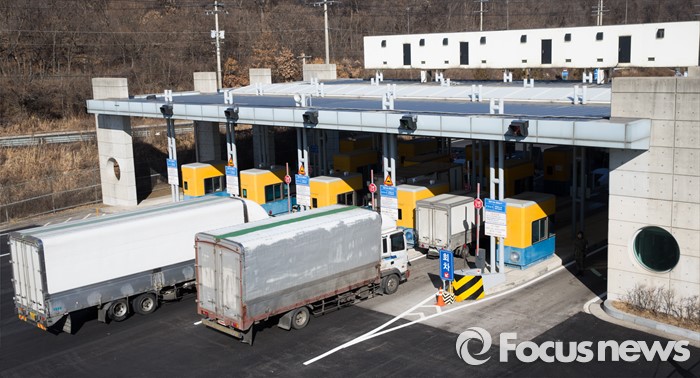 (파주=포커스뉴스) 7일 오후 개성공단 입주기업 차량들이 경기 파주시 남북출입사무소를 통해 입경하고 있다.