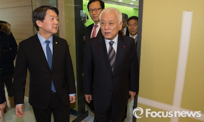 (서울=포커스뉴스) 야권 신당을 추진 중인 안철수, 김한길 무소속 의원이 7일 오후 서울 마포구 신당 당사에서 국민공감포럼 신당 참여 기자회견과 북한 핵실험 관련 성명 발표를 마친 뒤 대화를 나누고 있다.