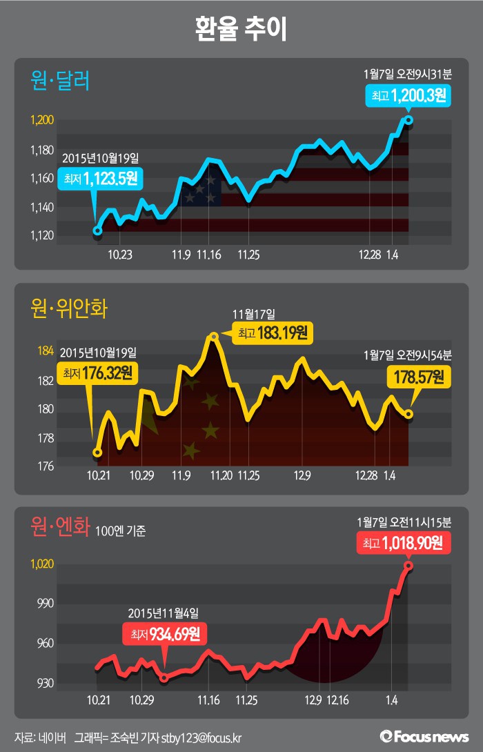 (서울=포커스뉴스) 중국증시 폭락 등 연초부터 커진 변동성에 대표적 안전자산으로 분류되는 달러화 외에 엔저를 추구하던 엔화도 강세 대열에 합류했다.