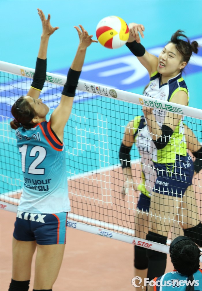 (서울=포커스뉴스) 7일 장충체육관에서 열린 '2015-2016NH농협 V-리그' 여자부 GS칼텍스-현대건설 경기에서 현대건설 양효진이 GS칼텍스 한송이의 블로킹을 피해 공격을 시도하고 있다.