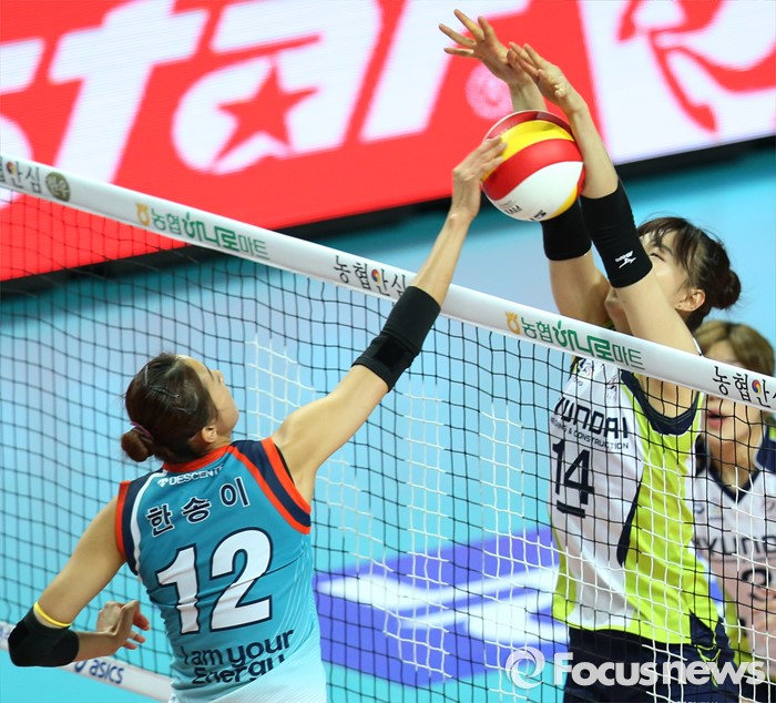 (서울=포커스뉴스) 7일 장충체육관에서 열린 '2015-2016NH농협 V-리그' 여자부 GS칼텍스-현대건설 경기에서 현대건설 양효진이 GS칼텍스 한송이의 공격을 블로킹으로 차단하고 있다.