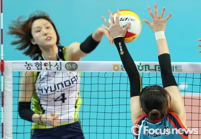 (서울=포커스뉴스) 7일 장충체육관에서 열린 '2015-2016NH농협 V-리그' 여자부 GS칼텍스-현대건설 경기에서 GS칼텍스 이소영이 현대건설 황연주의 스파이크를 블로킹으로 차단하고 있다.