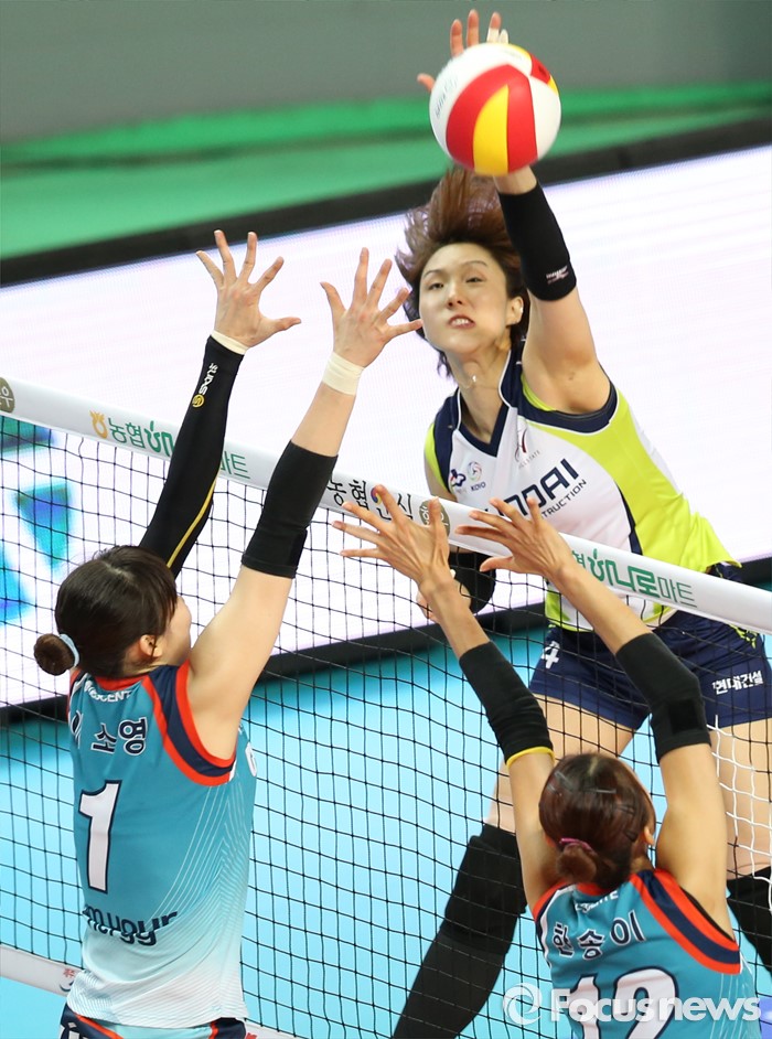 (서울=포커스뉴스) 7일 장충체육관에서 열린 '2015-2016NH농협 V-리그' 여자부 GS칼텍스-현대건설 경기에서 현대건설 황연주가 GS칼텍스 이소영, 한송이의 블로킹 위로 오픈 공격을 하고 있다.
