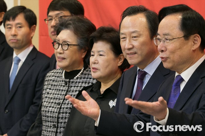 (서울=포커스뉴스) 이주영(오른쪽) 새누리당 저출산대책특위 위원장이 8일 오전 서울 여의도 국회 귀빈식당에서 열린 제3차 저출산대책특위회의에 참석해 기념사진 촬영 중 발언을 하고 있다.