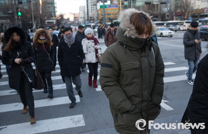 (서울=포커스뉴스) 오늘 아침 서울은 올해들어 가장 추운 영하 6.9도를 기록했다. 8일 오전 추운 날씨 속에 서울 중구 세종로사거리에서 시민들이 출근을 하고 있다.