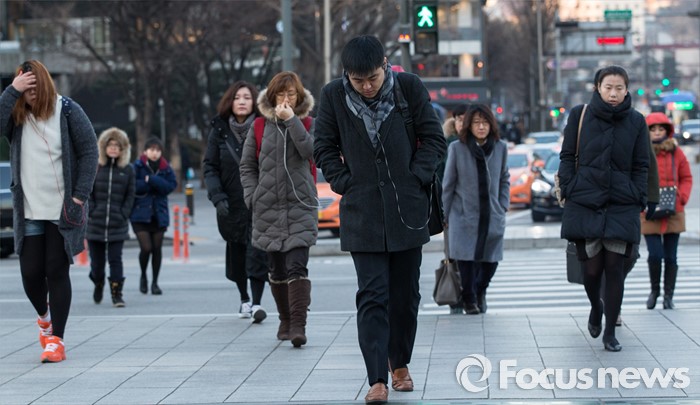 (서울=포커스뉴스) 오늘 아침 서울은 올해들어 가장 추운 영하 6.9도를 기록했다. 8일 오전 추운 날씨 속에 서울 중구 세종로사거리에서 시민들이 출근을 하고 있다.