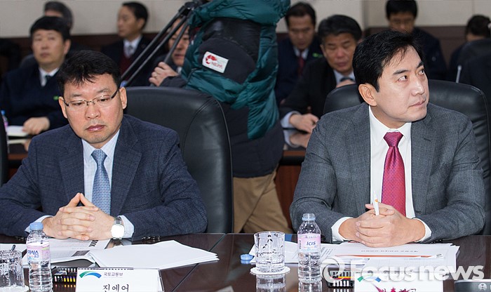 (서울=포커스뉴스) 마원(왼쪽) 진에어 사장과 최규남(오른쪽) 제주항공 사장이 8일 오전 서울 강서구 한국공항공사 대회의실에서 열린 저비용항공사(LCC) 긴급 안전점검회의에 참석해 자리에 앉아 있다.