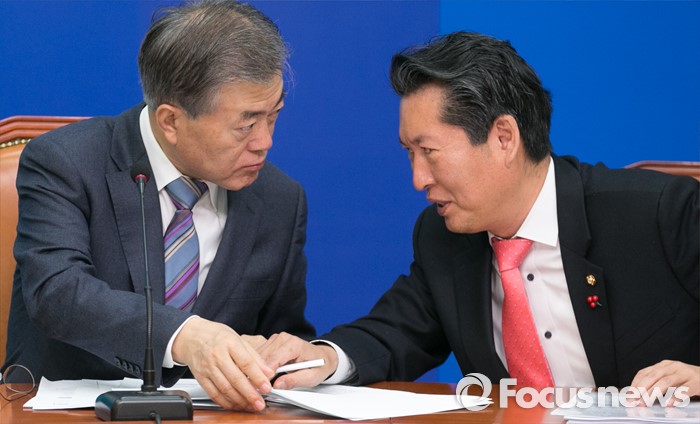 (서울=포커스뉴스) 문재인(왼쪽) 더불어민주당 대표와 정청래 최고위원이 8일 오전 서울 여의도 국회에서 열린 최고위원회의에 참석해 대화하고 있다.