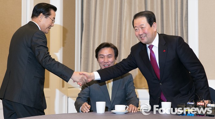 (서울=포커스뉴스) 더불어민주당을 탈당해 신당을 추진 중인 박주선(오른쪽) 의원과 박준영(왼쪽) 전 전남지사가 8일 오전 서울 여의도 국회 귀빈식당에서 신당 통합 논의를 위해 만나 인사하고 있다. 가운데는 김민석 전 의원.