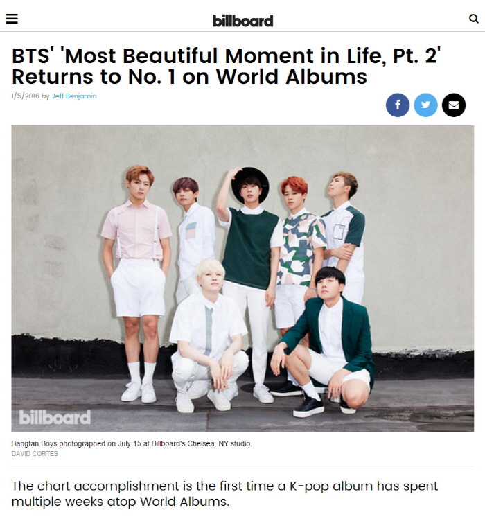 칼럼에 따르면 월드앨범차트 사상 K-POP 앨범이 여러 주 동안 정상을 차지한 것은 이번이 처음이다. 놀라움과 칭찬도 이어졌다. “방탄소년단이 그들의 최신 앨범 ‘화양연화 pt.2’로 빌보드의 월드 앨범 차트에서 두 번째 정상을 차지해 전례없는 위업을 달성했다"고 전했다.