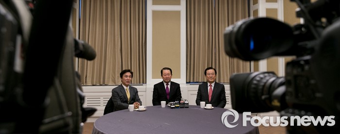 (서울=포커스뉴스) 더불어민주당을 탈당해 신당을 추진 중인 김민석(왼쪽부터) 전 의원, 박주선 의원, 박준영 전 전남지사가 8일 오전 서울 여의도 국회 귀빈식당에서 신당 통합 논의를 위해 만나 취재진에게 설명하고 있다.
