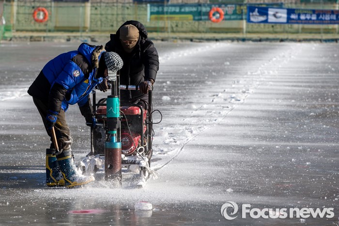 (화천=포커스뉴스) 강원중북부 지역에 한파주의보가 발효된 8일 오전 강원도 화천군 산천어축제 행사장인 화천천 얼음벌판에서 축제 관계자들이 낚시 구멍을 뚫고 있다.