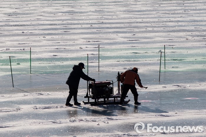 (화천=포커스뉴스) 강원중북부 지역에 한파주의보가 발효된 8일 오전 강원도 화천군 산천어축제 행사장인 화천천 얼음벌판에서 축제 관계자들이 낚시 구멍을 뚫고 있다.