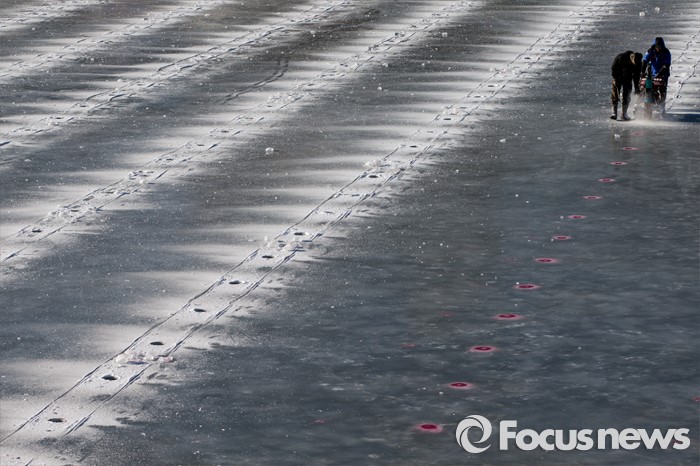 (화천=포커스뉴스) 강원중북부 지역에 한파주의보가 발효된 8일 오전 강원도 화천군 산천어축제 행사장인 화천천 얼음벌판에서 축제 관계자들이 낚시 구멍을 뚫고 있다.