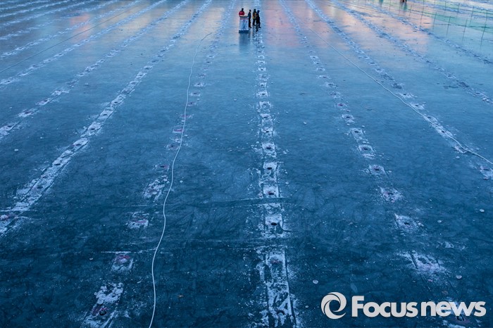 (화천=포커스뉴스) 강원중북부 지역에 한파주의보가 발효된 8일 오전 강원도 화천군 산천어축제 행사장인 화천천 얼음벌판에서 축제 관계자들이 행사장 점검을 하고 있다.