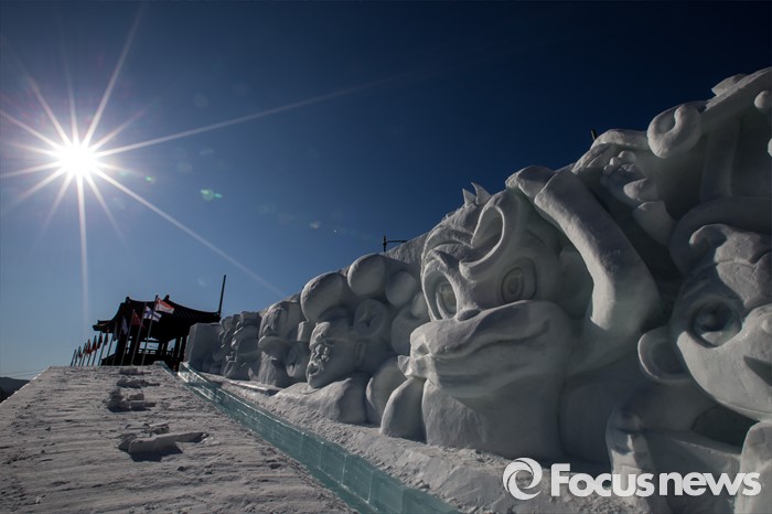 (화천=포커스뉴스) 산천어축제를 하루 앞둔 8일 오후 강원도 화천군 산천어축제 행사장인 화천천에 얼음조각 작품이 전시되고 있다. 산천어축제는 오는 9일부터 31일까지 강원도 화천군 화천천 및 3개읍면 일원에서 진행될 예정이다.