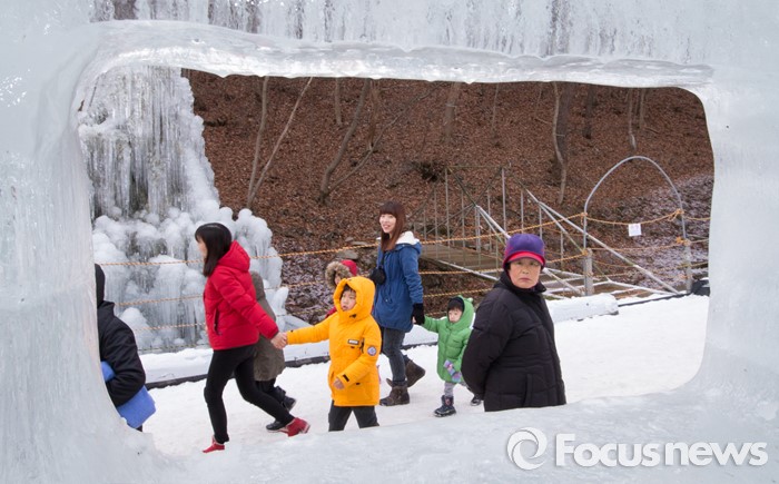 (청양=포커스뉴스) 8일 오전 충남 청양군 정산면 알프스마을에서 열린 칠갑산 얼음분수축제를 방문한 시민들이 얼음 조각을 관람하고 있다.