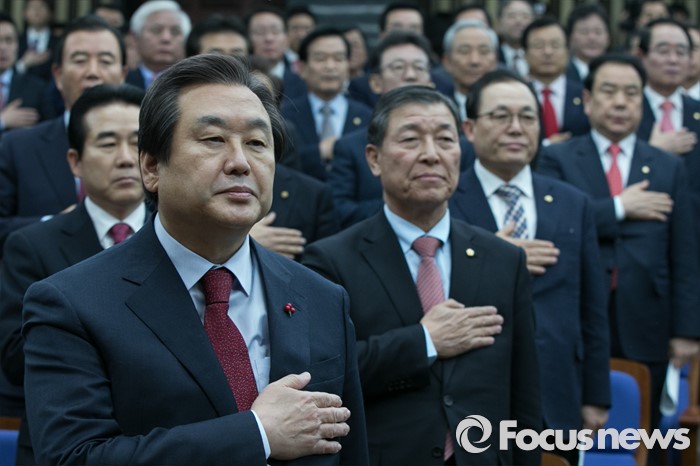 (서울=포커스뉴스) 김무성(앞) 대표를 비롯한 새누리당 의원들이 8일 오후 서울 여의도 국회에서 열린 의원총회에 참석해 국민의례를 하고 있다.