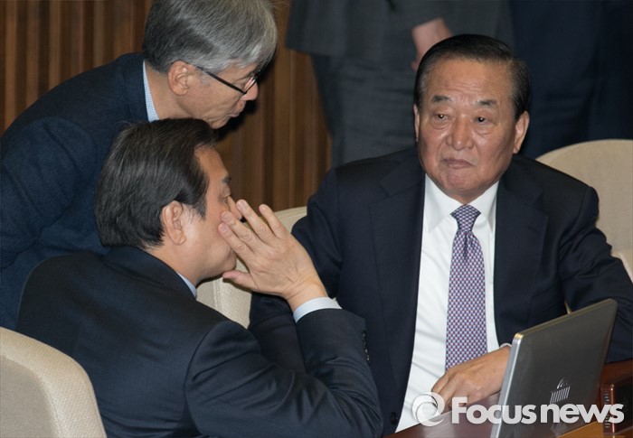 (서울=포커스뉴스) 8일 오후 서울 여의도 국회에서 열린 338회 국회(임시회) 3차 본회의에 앞서 김무성(왼쪽부터) 새누리당 대표, 여상규 의원, 서청원 최고위원이 대화하고 있다.