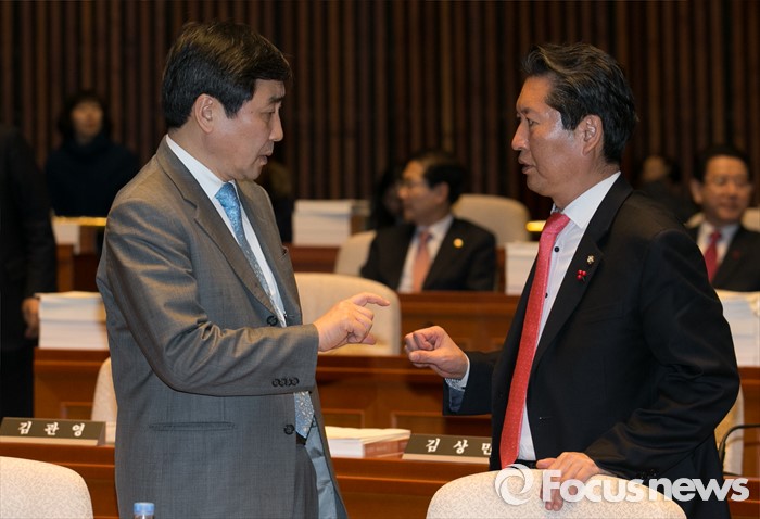 (서울=포커스뉴스) 이종걸(왼쪽) 더불어민주당 원내대표와 정청래 최고위원이 8일 오후 서울 여의도 국회에서 열린 의원총회에 참석해 대화하고 있다.