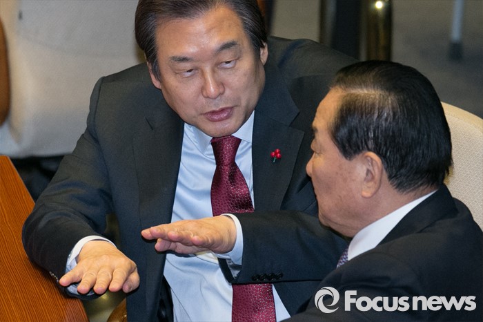 (서울=포커스뉴스) 김무성(왼쪽) 새누리당 대표와 서청원 최고위원이 8일 오후 서울 여의도 국회 본회의장에서 대화하고 있다.