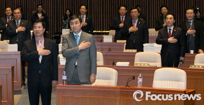 (서울=포커스뉴스) 이종걸 더불어민주당 원내대표와 신경민 정보위원회 야당 간사 등 의원들이 8일 오후 서울 여의도 국회에서 열린 의원총회에 참석해 국기에 대한 경례를 하고 있다. 이날 문재인 대표는 개인 일정 등으로 총회에 늦게 참석했다.