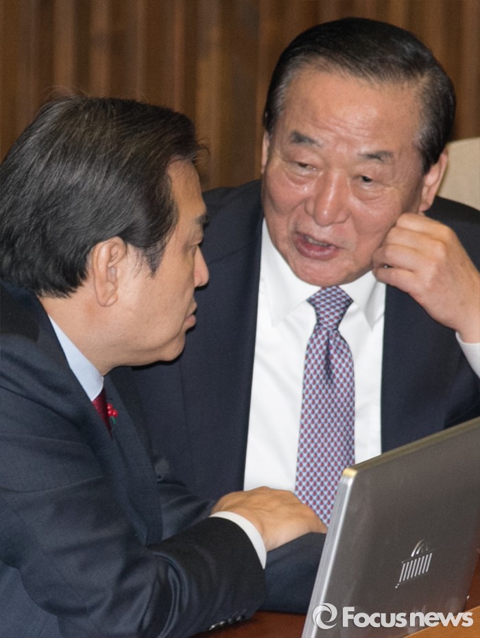(서울=포커스뉴스) 8일 오후 서울 여의도 국회에서 열린 338회 국회(임시회) 3차 본회의에 앞서 김무성(왼쪽) 새누리당 대표와 서청원 최고위원이 대화하고 있다.