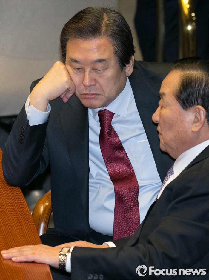 (서울=포커스뉴스) 김무성(왼쪽) 새누리당 대표와 서청원 최고위원이 8일 오후 서울 여의도 국회 본회의장에서 대화하고 있다.