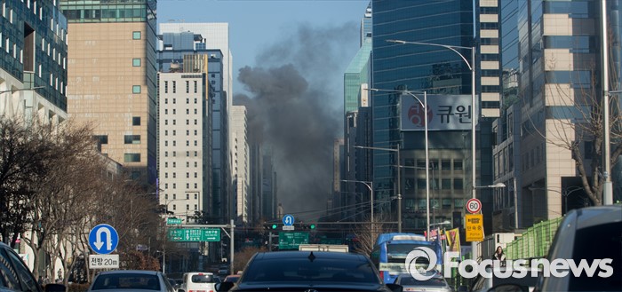 (서울=포커스뉴스) 8일 오후 3시 23분쯤 서울 강남구 역삼동의 공사 중인 한 빌딩에서 화재가 발생해 소방당국이 진화작업을 펼쳤다.