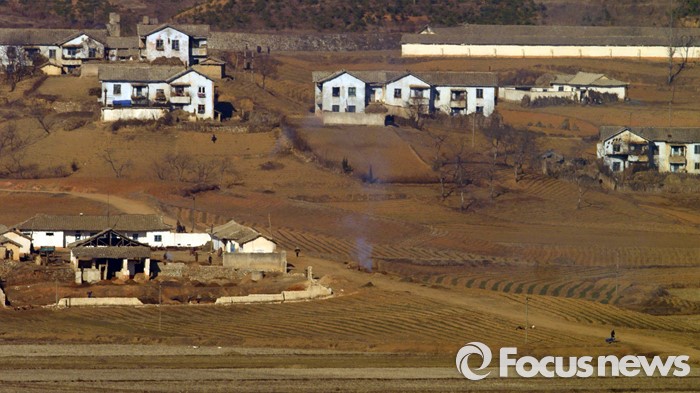 (파주=포커스뉴스) 군 당국의 대북확성기 방송 재개를 앞둔 8일 오전 경기도 파주 오두산 통일전망대에서 바라본 북한 개풍군 마을 주민들이 평온한 모습을 보이고 있다.