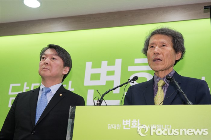 (서울=포커스뉴스) 안철수(왼쪽) 무소속 의원과 한상진 창당준비 위원장이 8일 오후 서울 마포구 안철수 무소속 의원 당사에서 열린 기자회견에서 신당에 첫 입당한 3명의 인사에 대한 입당 취소에 대한 설명을 하고 있다.
