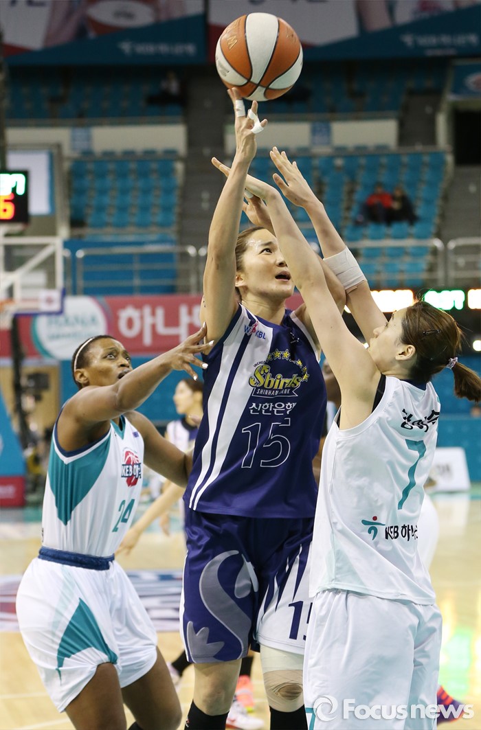 (부천=포커스뉴스) 8일 부천체육관에서 열린 2015-2016 여자프로농구 KEB하나은행-신한은행 경기에서 신한은행 신정자와 KEB하나은행 샤데 휴스턴과 강이슬의 마크를 뚫으며 점프슛을 쏘고 있다.