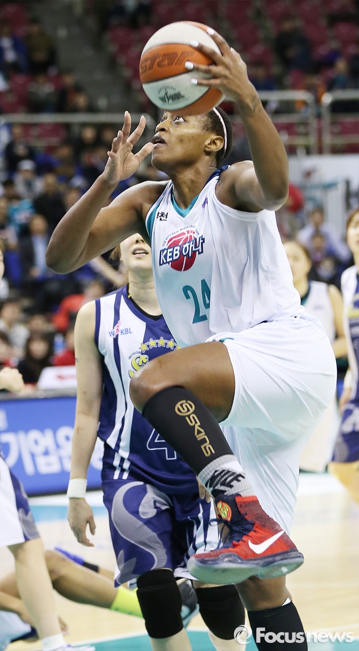 (부천=포커스뉴스) 8일 부천체육관에서 열린 2015-2016 여자프로농구 KEB하나은행-신한은행 경기에서 KEB하나은행 샤데 휴스턴이 레이업슛을 노리고 있다.