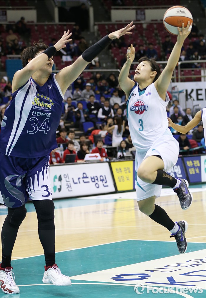 (부천=포커스뉴스) 8일 부천체육관에서 열린 2015-2016 여자프로농구 KEB하나은행-신한은행 경기에서 KEB하나은행 단신 가드 서수빈이 최장신인 신한은행 하은주를 앞에 두고 레이업슛을 시도하고 있다.