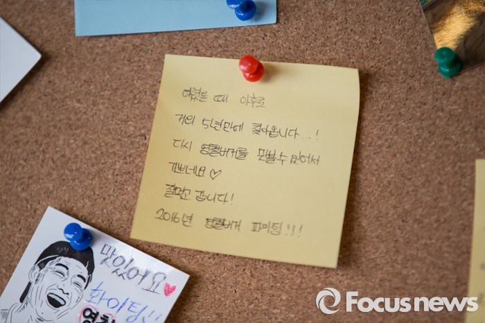 (서울=포커스뉴스)8일 오전 서울 성북구 '영철버거' 낙서판에 붙어 있는 손님들의 메시지. 고려대 앞 명물로 꼽히는 '영철버거'가 최근 경영난으로 문을 닫았다가, 고려대를 다녔던 학생들이 영철버거와의 추억을 잊지 못해 십시일반 도와 가게를 옮겨 재오픈 했다.