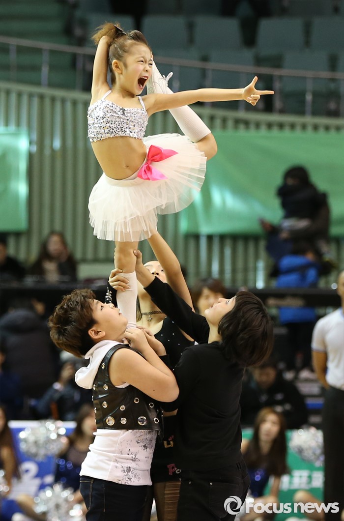 (서울=포커스뉴스) 15일 서울 잠실실내체육관에서 열린 2015-2016 프로농구 올스타전 오프닝 행사로 열린 연예인 농구팀-유소년 올스타 경기에서 어린이 치어리더 공연에서 예쁜 어린이 치어리더가 걍렬한 인상의 묘기를 보이고 있다.
