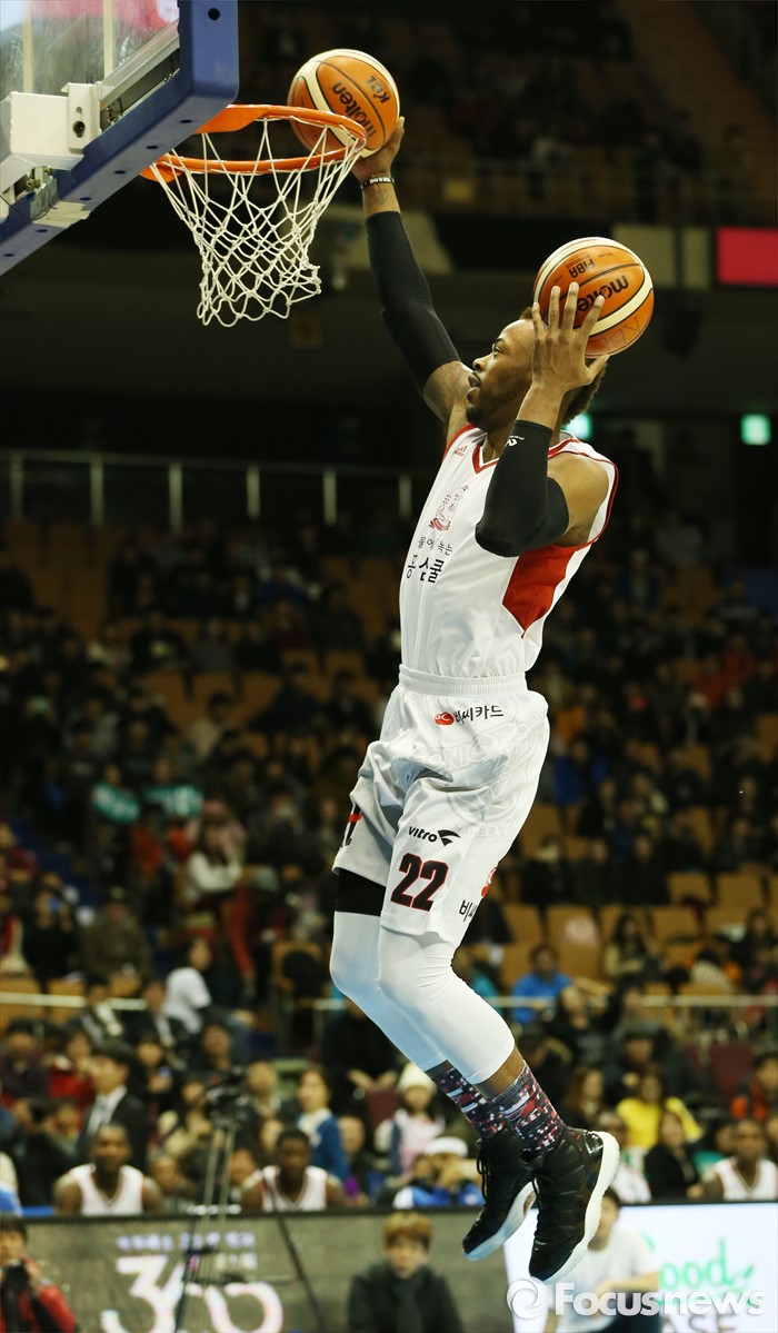 (서울=포커스뉴스) 10일 서울 잠실실내체육관에서 열린 2015-2016 프로농구 올스타전 덩크슛 콘테스트 예선에서 블레이클리가 공 두개를 순차적으로 덩크슛으로 넣는 묘기를 보이고 있다.