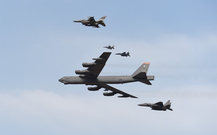 (서울=포커스뉴스) 북한의 수소폭탄 실험 이후 미국의 핵우산 제공 방침에 따라 미 공군의 전략 폭격기가 한반도로 전개한 10일 경기도 평택시 주한미군 오산공군기지 상공에 B-52 폭격기와 우리 공군의 F-15K와 미군 F-16 전투기의 호위를 받으며 비행하고 있다. <사진제공=국방일보>