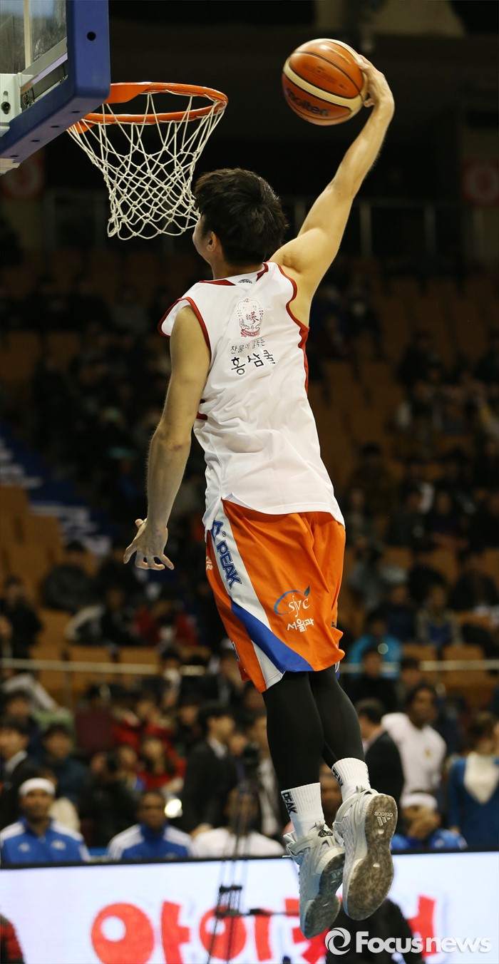 (서울=포커스뉴스) 10일 서울 잠실실내체육관에서 열린 2015-2016 프로농구 올스타전 덩크슛 콘테스트 예선에서 박준수가 원핸드 덩크슛을 시도하고 있다.
