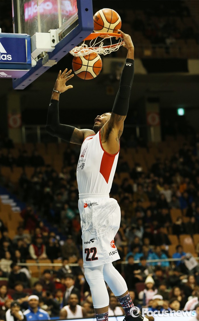 (서울=포커스뉴스) 10일 서울 잠실실내체육관에서 열린 2015-2016 프로농구 올스타전 덩크슛 콘테스트 예선에서 블레이클리가 공 두개를 순차적으로 덩크슛으로 넣는 묘기를 보이고 있다.