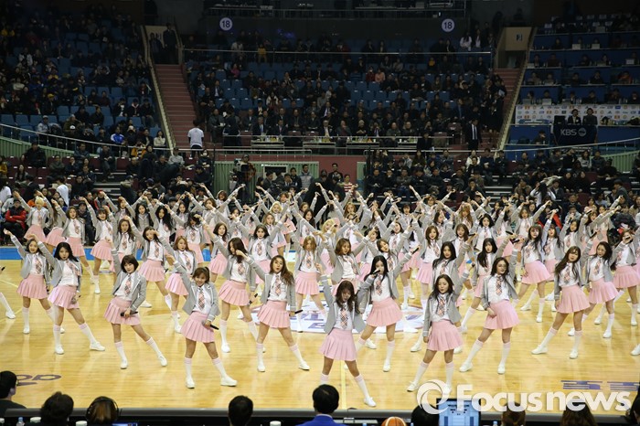 (서울=포커스뉴스) 10일 서울 잠실실내체육관에서 열린 2015-2016 프로농구 올스타전에서 101명의 걸그룹 연습생들이 합동공연을 펼쳐 코트의 열기를 달구고 있다.