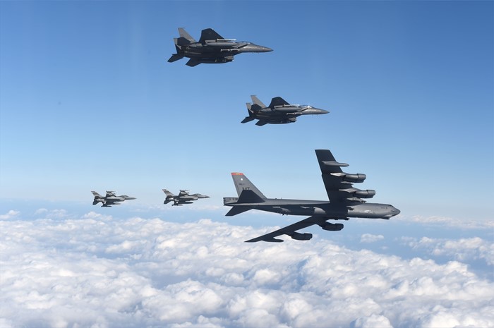 (서울=포커스뉴스) 북한의 수소폭탄 실험 이후 미국의 핵우산 제공 방침에 따라 미 공군의 전략 폭격기가 한반도로 전개한 10일 B-52 폭격기와 우리 공군의 F-15K, 미군 F-16 전투기가 한반도 상공을 날고 있다. <사진제공=공군>